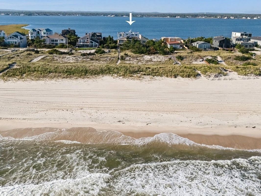 New to the market, this five-bedroom oceanfront beach house offers 132 feet of beach frontage with sweeping ocean views. The welcoming entry foyer leads to an expansive sun-filled living room with fireplace, dining area and den. The updated kitchen with quartz and granite countertops, Wolf stove, and Sub-zero refrigerator also has a cozy dining space with fabulous sunset views. A guest suite with bay views and an additional bedroom with access to the pool are on the main floor. Two additional en-suite bedrooms on the second level enjoy water views. The primary suite leads to an open terrace overlooking the pool area with panoramic ocean and bay views. Outdoor living is outstanding including a heated gunite pool, hot tub, and expansive deck for dining and entertaining. Your exclusive boardwalk leads directly from the deck to the sandy beach and rolling waves. Whether as a summer escape or a year-round residence, this oceanfront gem offers an extraordinary opportunity to create your own Hamptons haven in the truly special beach community of Westhampton Beach. Just minutes away from Main Street and the vibrant revitalized village with new boutique shops, restaurants, new movie theater, and Performing Arts Center.