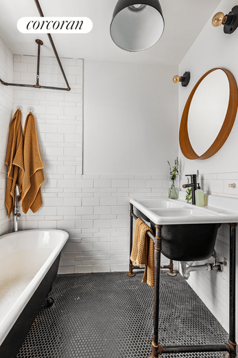 Retire to a primary bedroom with en-suite bath and note, all tile is custom designed! Discover the freedom of a European open shower, you'll never turn back. Soak in an extra-long, antique claw foot tub. The plumbing fixtures are Toto, Brizo, and Duravit. Feel super posh, with radiant heat flooring to keep toasty warm in the winter. Heating throughout was redone with restored classic radiators. Every nook in this apartment has been thoughtfully designed and built. One floor up, facing inner courtyards, and as quiet as can be.
