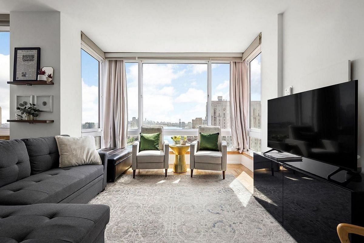 This thoughtfully renovated residence features a bright, airy layout with large windows that flood the space with natural light and showcase unobstructed river views. The updated pass-through kitchen is outfitted with sleek cabinetry, stainless steel appliances, and elegant stone countertops-perfect for both cooking and entertaining.