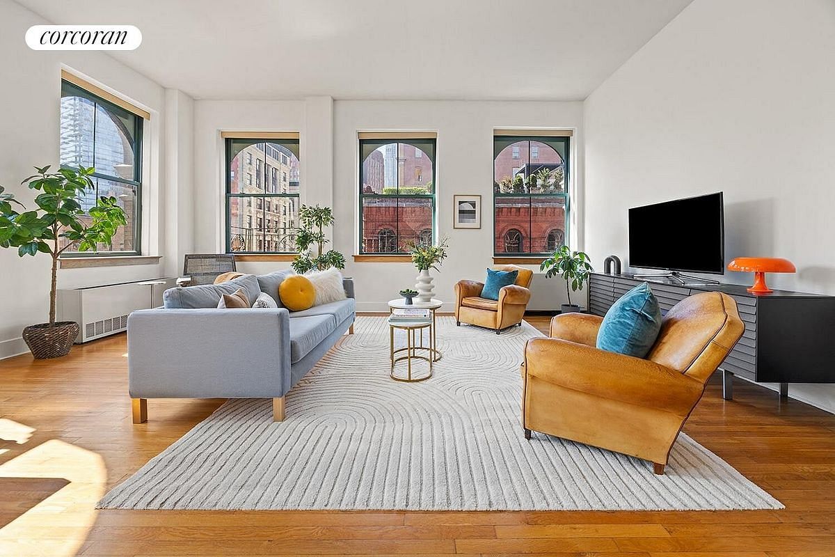 Wraparound oversized windows frame sweeping views over Tribeca's landmarked rooftops and cobblestone streets. The great room spans over 20 by 22 feet beneath soaring 11-foot ceilings, with warm hardwood floors and generous proportions. Tucked away from the main living area, the kitchen features quartz countertops, stainless steel appliances, and wine fridge.