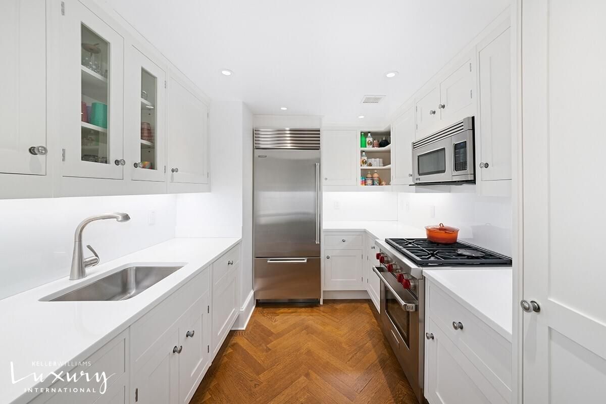 Large double-paned windows, including one of the buildings distinctive curved windows, allow sunshine from the eastern exposure to bathe the apartment in light. The wide, spacious kitchen by Smallbone of Devizes is comprised of pristine white granite countertops, custom cabinets, including two glass-paned doors for display, a Sub-Zero refrigerator, a Wolf stove and a Bosch dishwasher.