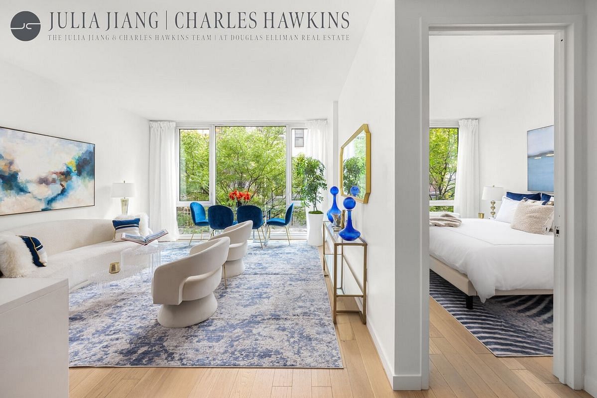 The modern galley kitchen is equipped with premium finishes, including quartz countertops, a Bertazzoni gas range and oven, a quiet dishwasher, and a Liebherr refrigerator, all complemented by sleek Italian cabinetry. The generously sized bedroom provides ample space, while the bathroom includes a deep soaking tub, handheld and rain-head shower fixtures, and an elegant Italian floating vanity. For added convenience, the apartment also includes a washer and dryer, with individually controlled heating and cooling.