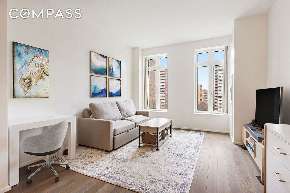 The elegant kitchen features honed Perla Venata countertops, chef-grade Miele appliances, and custom oak cabinetry with craftsman-inspired details and pewter hardware. The primary bathroom is finished with honed Windsor Cream marble, a soaking tub, a large frameless glass shower, pewter fixtures, and a custom oak-and-travertine vanity. Other features include Advanced ClimateMaster HVAC systems, in-unit Whirlpool or GE laundry, and recessed LED lighting. The apartment is bathed in natural light and enjoys expansive open sky views.