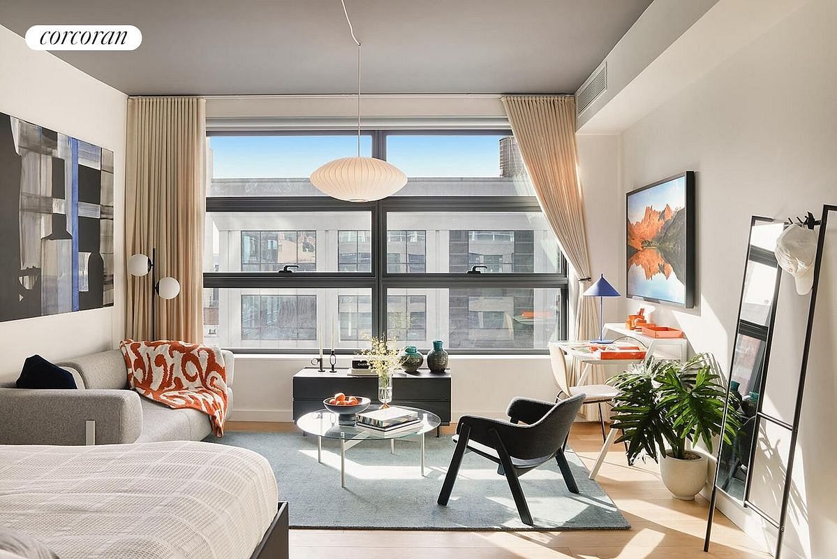 Residence 508 is a perfectly designed 469 sq. ft. studio residence with north exposure, that looks out onto a lush, landscaped viewing garden, creating an unexpected and transportive experience in the heart of Hell's Kitchen. The galley kitchen features dramatic marble countertops and backsplashes, custom cabinetry with ample storage, and appliances by Miele and Bosch, creating a generously sized kitchen not common for studio residences. The stylishly designed bath features grey terrazzo flooring, pale grey ceramic wall tiles, a honed grey marble countertop on custom matte black vanity, matte black fixtures by Rohl, and a pocket door separating the bathroom from an entry vestibule. All homes at 547 West 47th Street are completed with conveniences such as an in-residence washer and dryer, central air conditioning, private storage included with each home, and motorized roller shades at windows, making these homes perfect urban oasis.