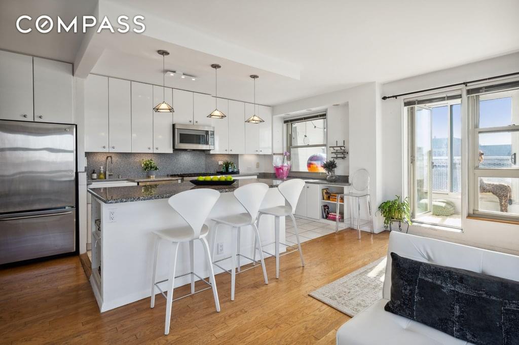 Discover the ultimate in urban living on the Upper West Side with this rare 2-bed, 1-bath turn-key apartment located at 549 West 123rd Street. This high-floor unit features a large glass-enclosed balcony that adds extra living space, perfect for a home office or play area. The apartment has undergone a complete renovation and boasts hardwood floors, ample storage, and abundant natural light from its south and western exposures. Take in breathtaking views of the Hudson River and stunning sunsets from your living room, dining area, and kitchen. The renovated kitchen features granite and Corian counters, custom cabinets, and high-end appliances including a 5 burner Thermador range and dishwasher, and a GE stainless refrigerator and French country sink. The bedrooms are spacious and comfortable, with custom closets and river views.