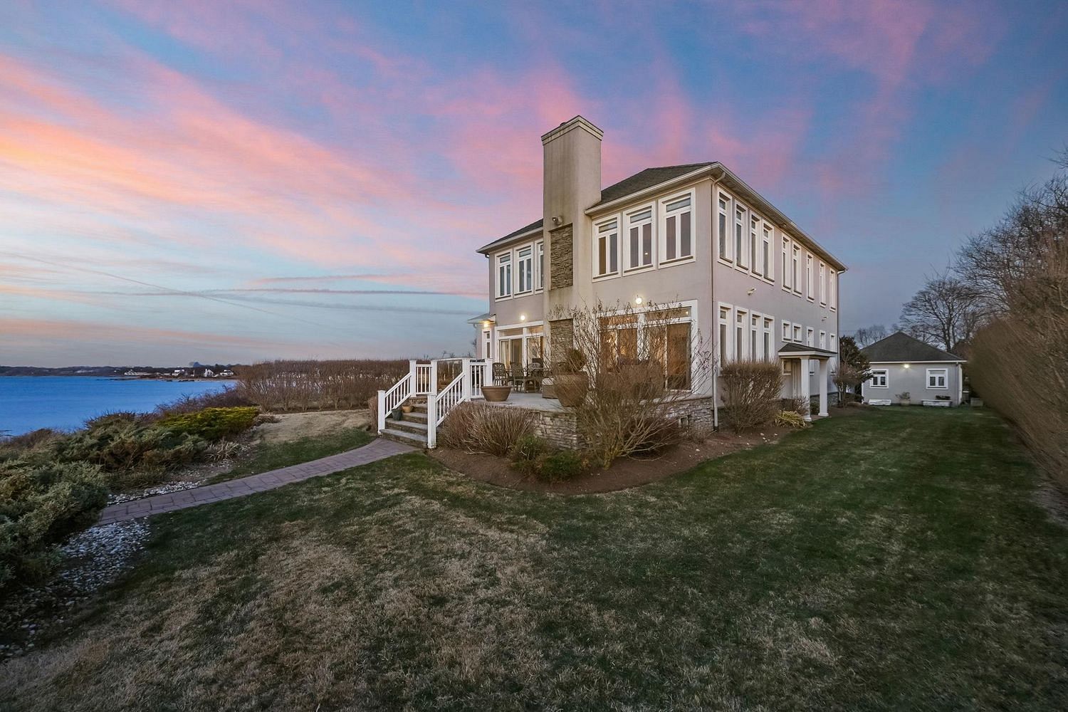 Southold, North Fork. This exceptional waterfront estate features a private beach on Long Island Sound and offers stunning sunsets that enhance its luxurious, resort-like atmosphere. Conveniently located between the vibrant maritime village of Greenport and the charming hamlet of Southold, .71 acres of level land designated as a FEMA safe zone (Zone X). With approximately 78 feet of bulkheaded waterfront, the residence is elevated on a promontory to capture breathtaking views of the beach and the Connecticut coastline. The open floor plan is perfect for entertaining, allowing every room to showcase spectacular vistas. A grand foyer greets guests, leading to a sunlit living room with fireplace and beachside terrace access, complemented by a spacious dining room and den. The gourmet kitchen is a chef's dream, featuring premium stainless-steel appliances, sleek stone countertops, and a mosaic backsplash. The main floor includes a stylish guest bathroom and an owner’s suite with a full bath. Upstairs, the expansive second-floor owner’s suite boasts a fireplace, a luxurious full bath, and a walk-in closet that doubles as an office, along with two additional en suite bedrooms.