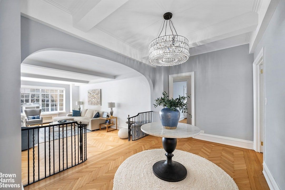 Upon entering, its gracious gallery anchors the entertaining and living areas, beginning with a step-down living room, wrought iron railings, original herringbone floors, and direct views of the breathtaking, landmarked Tiffany Studio-designed stained glass windows next door. The large, light-filled corner dining room is convertible to a third bedroom, media room or office. The exquisitely designed kitchen has abundant white cabinetry, ample pantry shelving, marble-top counters and backsplashes, Belgian block flooring, high-end stainless steel appliances, including Wolf range/oven with vented hood, Miele dishwasher, Samsung refrigerator, built-in banquette seating, and stackable Electrolux washer/dryer in laundry closet. The gracious corner primary bedroom suite features a windowed en-suite marble bath and ample walk-in closets with herringbone white marble-tiled floors echoing the pattern of the wood. The second bedroom has windowed marbled bath, including a glass-enclosed shower. This home has extraordinarily large windows and 9" ceilings.