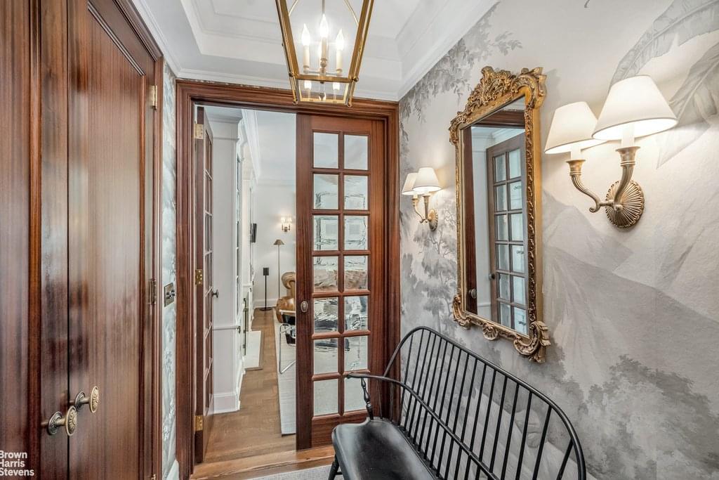 The semi-private landing of this elegant apartment leads to a hand-painted papered entrance gallery with grand custom mahogany woodworking, abundant storage, and hand-blown glass doors. This stately entrance connects you to the well-proportioned living room fitted with a classic marble wood burning fireplace.