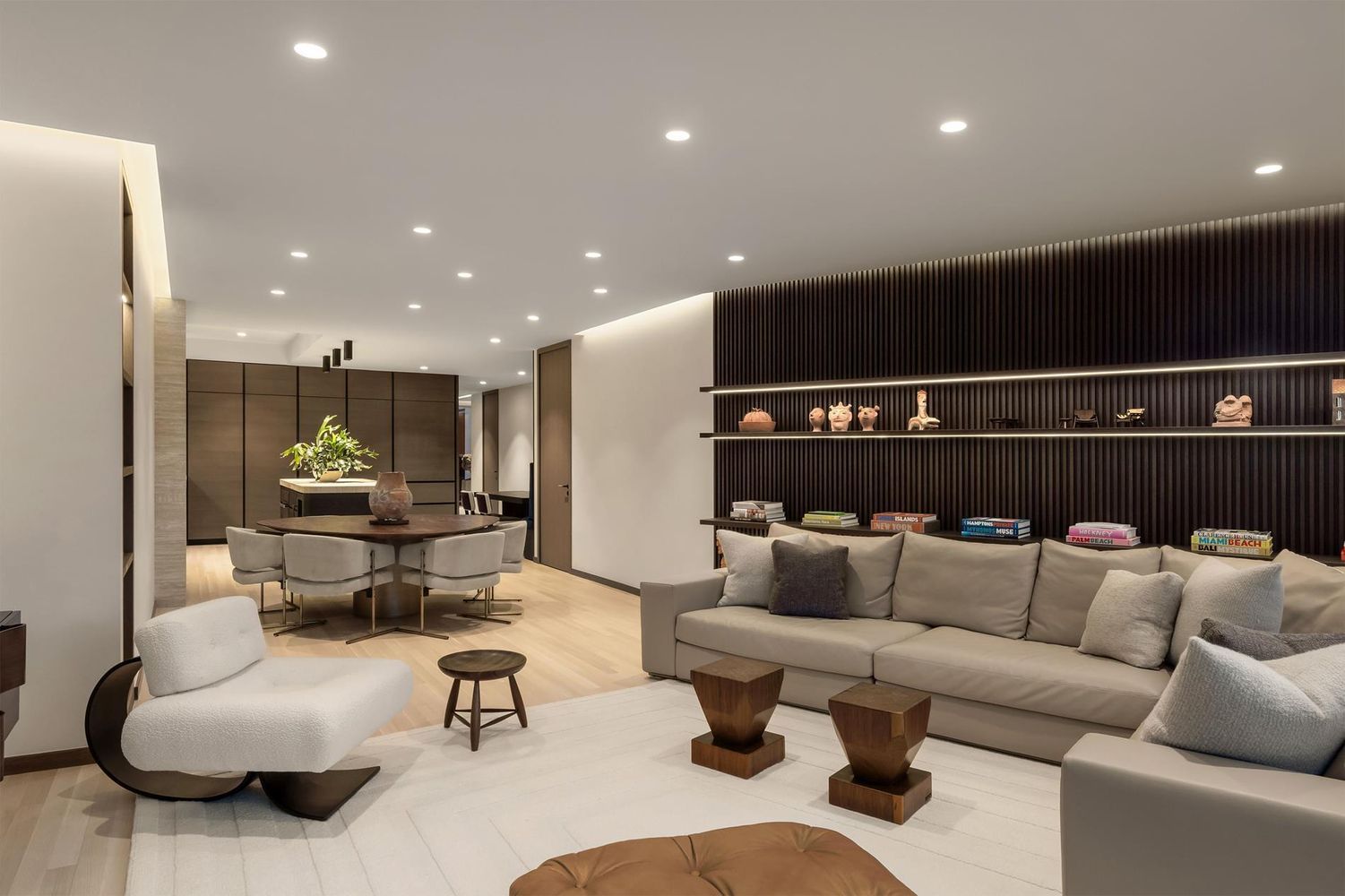 The dining area, with seating for 6+ guests, seamlessly connects to the living room, which showcases the signature Ikonni slatted wall design.