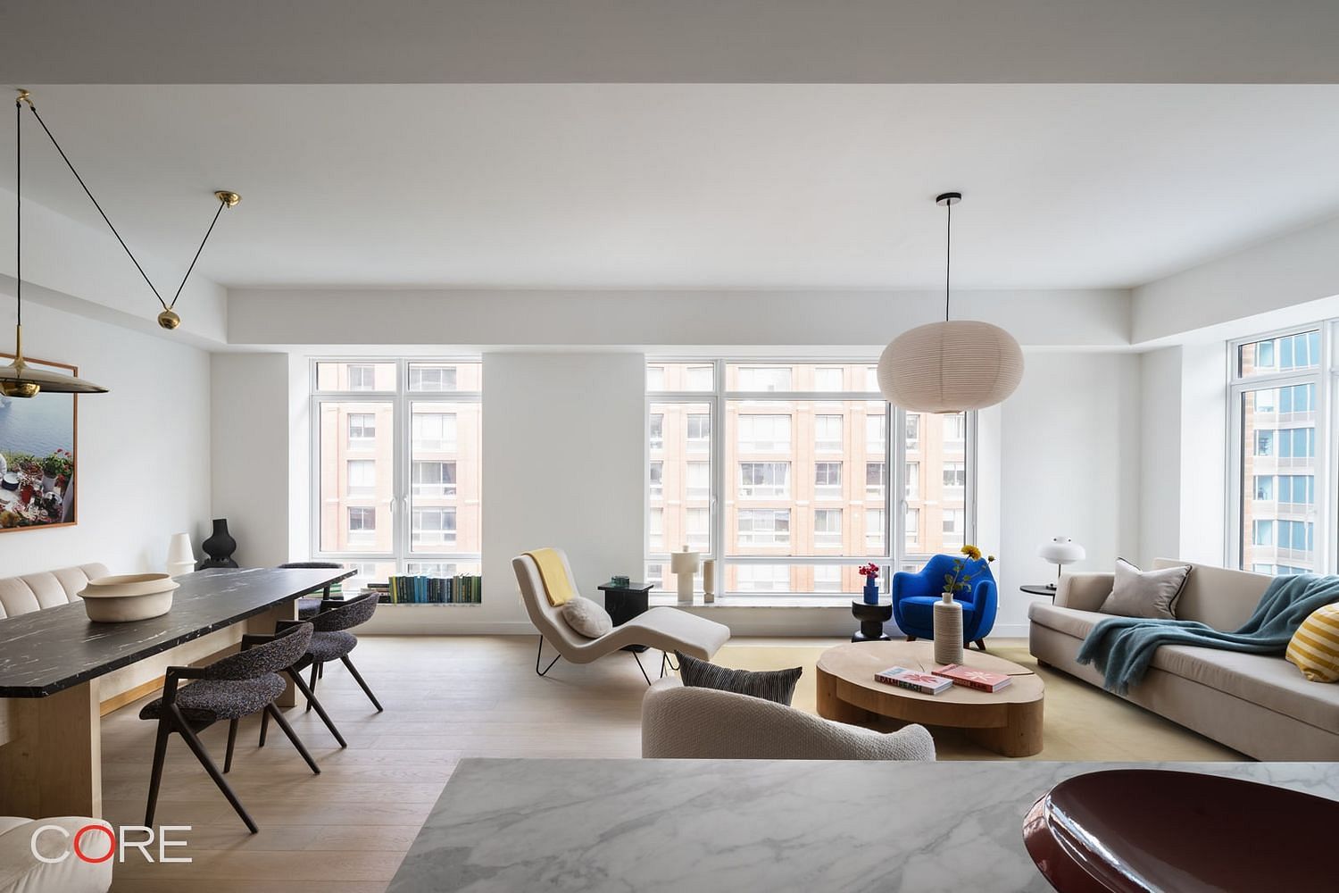Residence 8DE is 2,305 SF with three bedrooms and three-and-a-half bathrooms. The expansive, open-plan living and dining areas feature north and south exposures, a 28-foot corner great room, a kitchen with a custom Olson Kundig-designed Jackbox, warm wood flooring, floor-to-ceiling windows, and a master suite with double walk-in closets.
