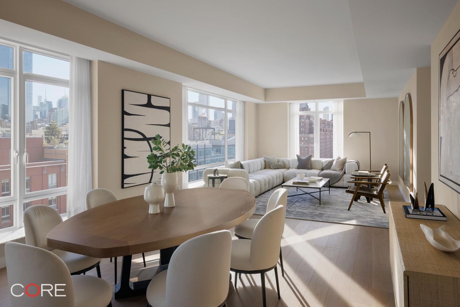 Residence East PH16B is 2,752 SF with three bedrooms and three-and-a-half bathrooms. The expansive, open-plan living and dining areas feature north, south and east exposures, a 31-foot corner great room, a windowed kitchen with a custom Olson Kundig-designed Jackbox and walk-in pantry, warm wood flooring, and floor-to-ceiling windows. The primary bedroom suite offers a large walk-in closet.