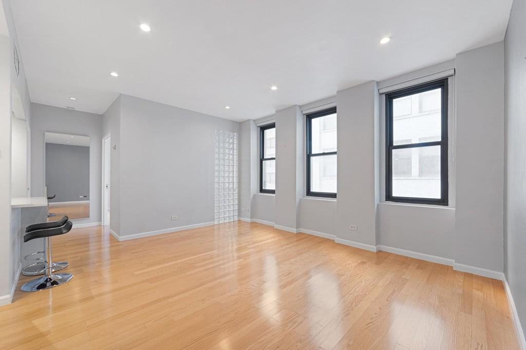 Enjoy only 1 of 5 apartments at 56 Pine with open views facing West, flooding the apartment with light! You can easily convert this spacious one bedroom, one bathroom apartment into a 2 bedroom apartment. See the alternate floor plans to see what options are possible! The apartment is on the northwest corner of the 15th floor with open views from the west facing bedroom. With a total of 8 floor-to-ceiling windows, youll have ample natural light to brighten your home. The entryway offers a large double closet and pantry closet which flows into a spacious living room that boasts three windows and an open-layout kitchen featuring stainless steel appliances including a dishwasher and microwave. The current layout features a bedroom large enough to fit a king-sized bed with room to spare with windows facing north and west as well as an oversized, double closet and a small sitting area. Relax in the full-size bathtub in your newly renovated bathroom.