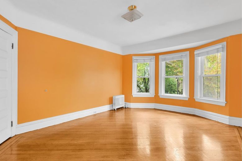The extra-wide stairwell leading to the second-floor apartment is highlighted by a stunning stained-glass window, casting a beautiful spectrum of light. The upstairs unit is move-in ready, featuring an eat-in kitchen, full bath, and two bright, equally sized bedrooms. This space can easily be duplexed with the parlor floor or extended into the third-floor potential 1-bedroom unit, providing endless possibilities.
