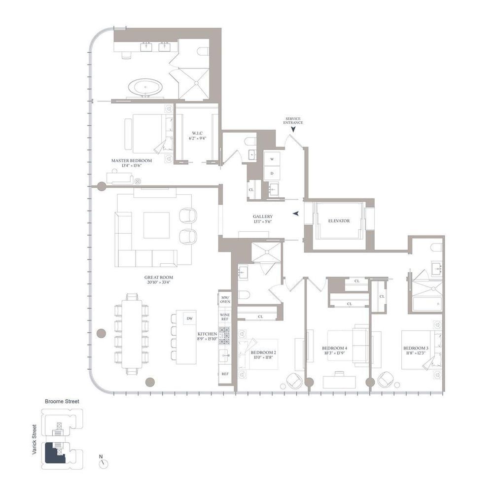 Additional amenities include a double height attended lobby with a 24-hour doorman and concierge, 55-foot indoor heated lap pool with steam room, sauna, Fitness Center with yoga studio, children's playroom, and an interior landscaped lounge with 92-foot ceilings, a live green wall and library. This building also has automated parking available for purchase. Unlike any other property in SoHo, 565 Broome SoHo offers the luxury and convenience of a private covered porte cochere with automated parking, expansive views and 17,000 square feet of amenities. 565 Broome Soho is Pritzker Prize-winning architect Renzo Piano's first New York City residential project. Rising 30 stories, 565 Broome Soho offers cinematic views of the Manhattan skyline, historic Soho, Hudson River, and beyond through a curved facade clad in low-iron glass, resulting in incredible light throughout all residences. 565 Broome SoHo provides the intimacy of a boutique SoHo building with the exceptional views and amenities of a full-service modern condominium. As the tallest residential property in SoHo, the building's design has been thoughtfully conceived to reflect the neighborhood's rich history while taking full advantage of its stunning views and light.