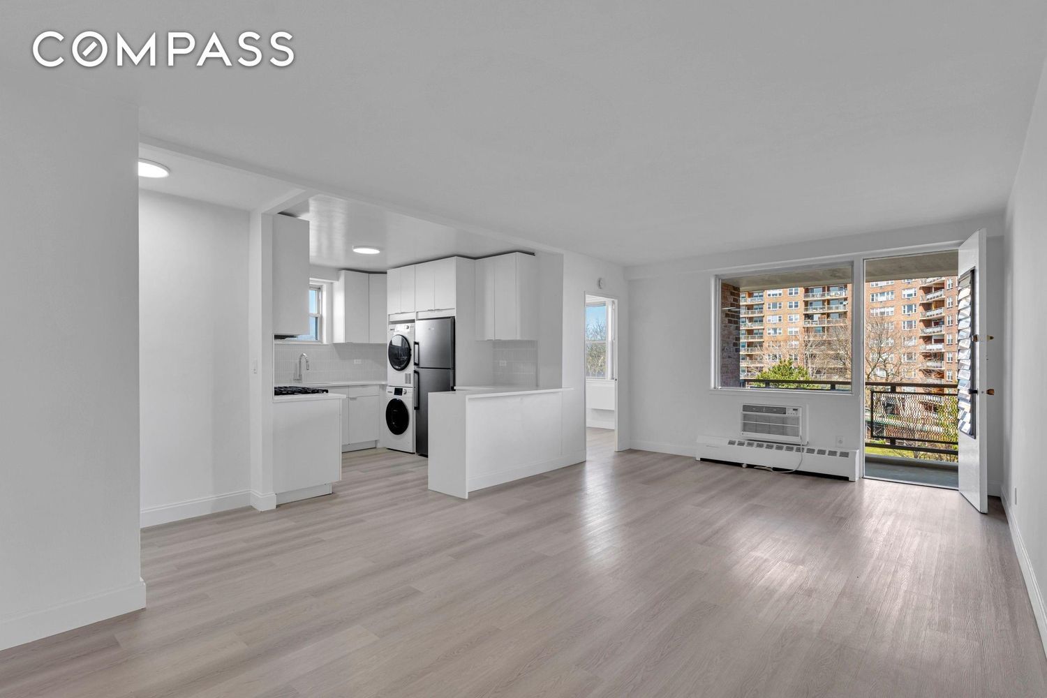 Modern Windowed Kitchen: Outfitted with sleek white cabinetry, quartz countertops, stainless steel appliances, and a stacked washer and dryer for everyday convenience.