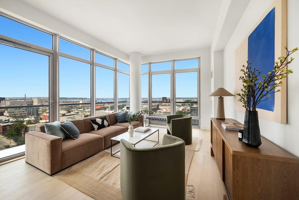 Penthouse A is memorizing the moment you enter the home. Embark on the open floor plan, taking you seamlessly from the gracious entry to a grand dining and corner living room with 11' high ceilings and floor to ceiling windows, offering stunning views overlooking New York Harbor and Lower Manhattan. This sun-drenched penthouse offers three spacious bedrooms, two full baths, and a wrap-around balcony off the living room, providing you and your guests a private escape above it all with views of the Statue of Liberty. The open floor plan features 7" European oak wood flooring, a custom kitchen with walnut cabinetry, fully integrated Thermador and Bosch appliance package, Blum German hardware with soft close drawers, and gleaming Alleanza quartz countertop with matching backsplash. The oversized primary bedroom with double closets offers a stunning en-suite bathroom with Dolomiti marble tile wall and slab countertops, Waterworks fixtures, custom oak vanity with double Kohler sinks. Two generously sized secondary bedrooms, with additional full bathroom, features a soaking tub, porcelain tile walls and flooring providing spa-like comfort. The powder room features statuary Venatto Clasico stone textured accent wall with custom brass frame mirror and oak console washbasin. A washer/dryer and multi-zone heating and cooling system complete this luxurious, modern home.