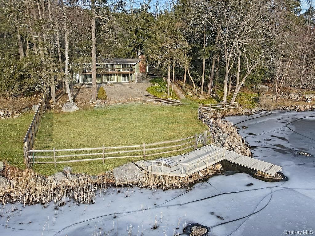 Set along the shoreline of Lake Oscaleta, this direct waterfront home offers a rare combination of privacy, natural beauty, and truly usable lakefront property in the heart of South Salem. Occupying .564 acres with sweeping frontage on one of the area's most peaceful glacial lakes, the setting is defined by something increasingly hard to find - an expansive, level lawn that extends all the way to the water. Unlike many lakefront properties where steep slopes limit access and usability, this property offers a broad, open yard ideal for entertaining, recreation, or simply enjoying the outdoors. The gentle approach to the lake creates an effortless connection between the home and the water, making everyday use as practical as it is beautiful. At the shoreline, a substantial private dock and swim platform provide immediate access to the lake, whether for launching kayaks and paddleboards or spending long summer days in and around the water. Lake Oscaleta is known for its depth and quiet character, with limited motorized use that preserves its calm, reflective setting. The home itself has been thoughtfully updated and is designed to maximize its connection to the lake. The main level, offering approximately 1,578 square feet, is centered around an open living and dining space with vaulted, wood-beamed ceilings and a striking brick fireplace that anchors the room. Walls of glass and sliding doors frame the water from nearly every angle, filling the home with natural light and providing seamless access to the expansive deck - perfect for dining, entertaining, or simply taking in the view. The kitchen integrates comfortably into the living space, creating an easy flow for both everyday living and gatherings. The primary bedroom enjoys direct access to the deck and lake views, while two additional bedrooms and well-appointed baths complete the main level. The home is also equipped with an automatic whole-house generator, providing peace of mind and uninterrupted comfort year-round. The full walkout lower level adds approximately 1,200 square feet of flexible living space, ideal for guests, recreation, or extended stays. With its own fireplace, multiple seating areas, and direct access to the stone patio and backyard, it functions as a true extension of the home, offering both comfort and versatility. Outside, the landscape has been designed to complement the natural setting, with a combination of lawn, stonework, and mature trees creating multiple outdoor living areas without sacrificing the openness of the yard. From the elevated deck to the covered patio below, every space is positioned to take advantage of the lake. Just minutes from the hamlets of South Salem and Ridgefield, and within easy reach of Metro North and major highways, this is a property that offers both escape and accessibility. A rare opportunity to own a level, highly usable waterfront property with a substantial dock on one of Northern Westchester's most serene lakes.