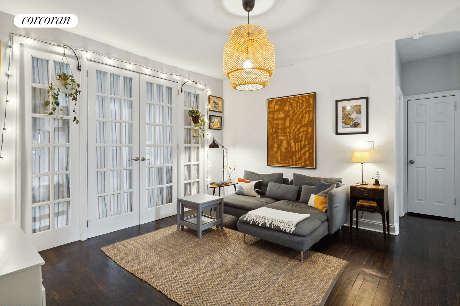 The primary bedroom is oversized with huge closet and a secondary bedroom features a set of beautiful French doors. The renovated windowed bathroom is modern and minimal.