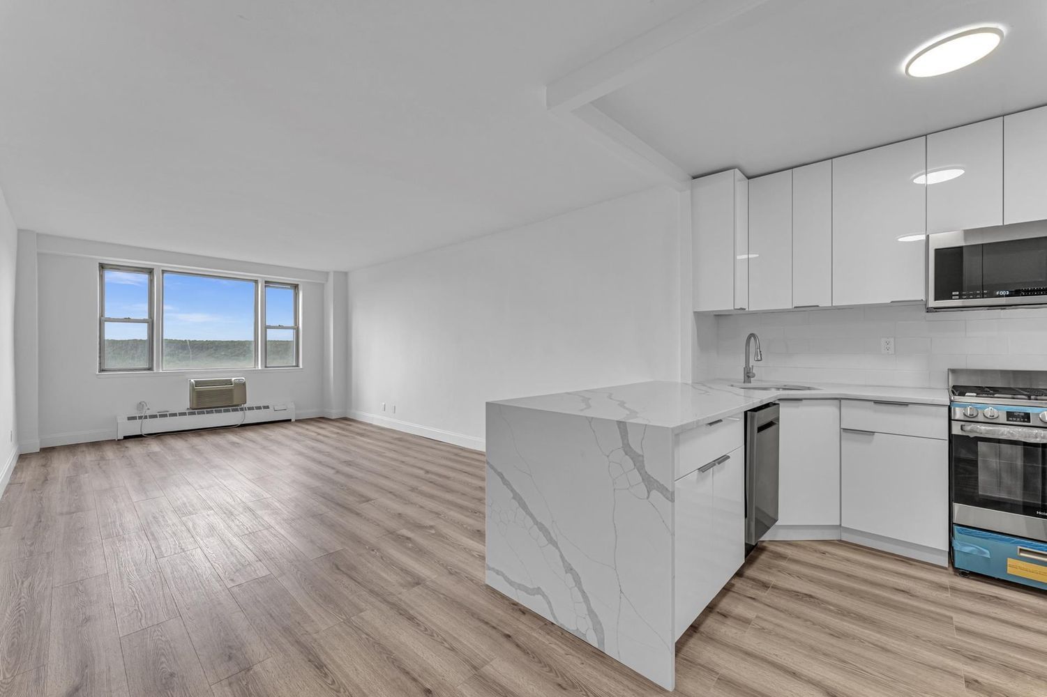 Step into this elegantly renovated studio featuring a sleek, open-concept kitchen complete with high-gloss cabinetry, quartz countertops, and state-of-the-art stainless steel appliances. The expansive living area, adorned with wide-plank hardwood flooring, offers a bright and airy space to relax or entertain. Large windows frame breathtaking, unobstructed views, ensuring a daily dose of natural light and picturesque scenery.