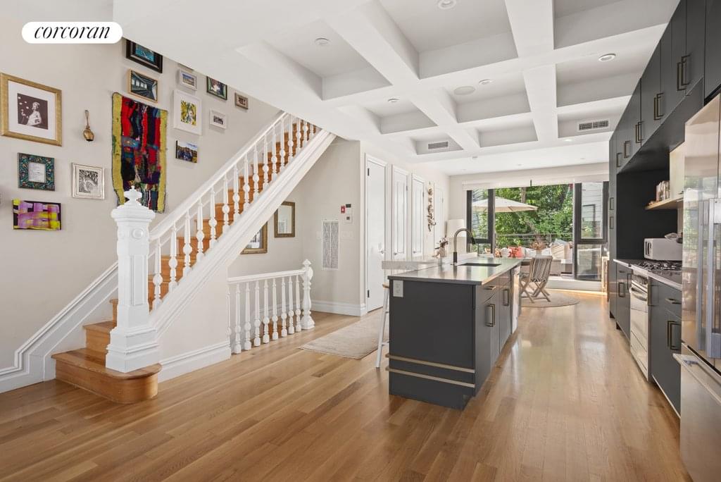 Calling all culinary enthusiasts! The parlor floor boasts a chef's kitchen complete with Fisher & Paykel stainless steel appliances, including a dishwasher, 6-burner stove, and double-door refrigerator. Slate gray floor-to-ceiling cabinets, quartz and Caesarstone countertops, brushed brass hardware, and a unique coffered ceiling add a touch of elegance to every meal.