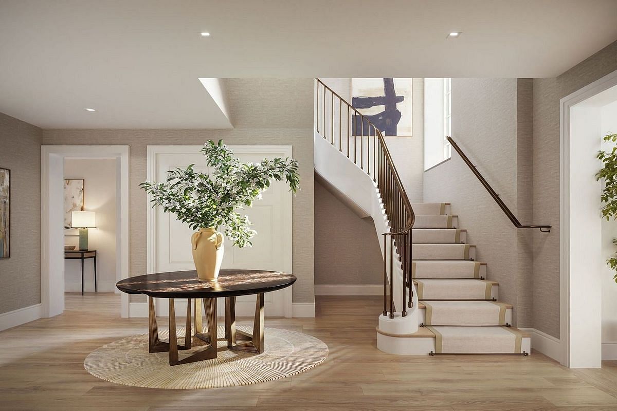 Residents enjoy a full suite of amenities, including a 24-hour attended lobby and concierge, an atrium lounge with a skylight, a decorative fireplace, and a catering kitchen, a dining room, and a custom bar with individual wine and spirit cabinets. The building also offers a fitness center curated by The Wright Fit, a golf simulator suite, a tranquility lounge, private storage, bicycle storage, and a mail and package room with cold storage.