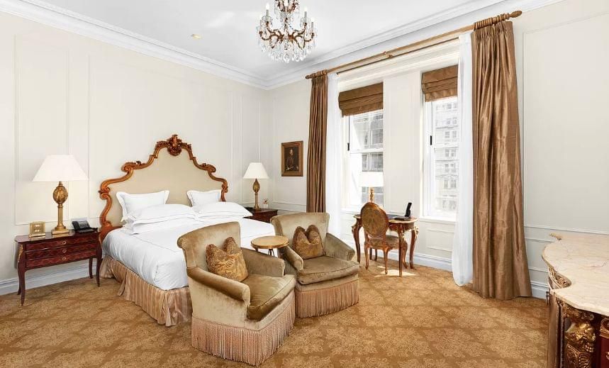 Suite 1441 at the world-renown Plaza Hotel offers the ultimate five-star service in this corner condominium suite with sunny south and west facing exposures and a spacious sitting area with a coffee table and chairs, a writing desk with a chair, and a butler’s pantry. Exquisitely decorated in an updated version of the Louis XV style with the highest quality textiles in a sophisticated palette of natural colors, this unit also features a generously sized bath decorated with inlaid marble mosaic tile and adorned with 24-carat gold plated Sherle Wagner fixtures. In-suite amenities include high-speed wireless Internet access and wall-mounted flat-screen television.