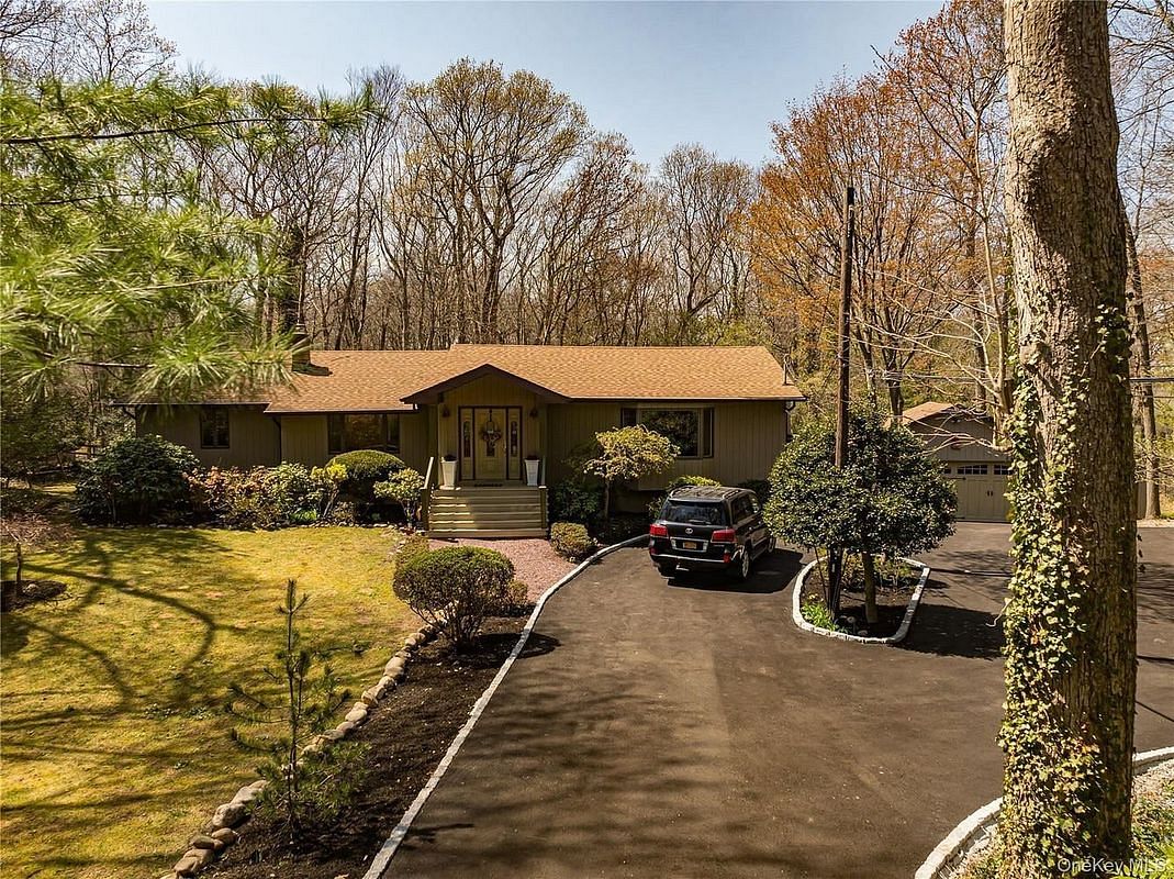 Privacy at its best! Nestled on 1.2 acres of beautifully wooded property, this unique expanded ranch offers direct access to the Northport Rail Trail. This spacious home features 5 bedrooms and 3 full baths, highlighted by stunning floor-to-ceiling windows, a wood-burning fireplace, and custom built-in bookshelves. The oversized kitchen is perfect for entertaining, complete with granite countertops, gas cooking, a wine fridge, center island, and a large bay window overlooking the serene setting. The primary suite is a true retreat, featuring floor-to-ceiling windows and direct access to the deck—perfect for enjoying the peaceful backyard. The en-suite bath includes a private sauna for ultimate relaxation. The walk-out basement is filled with natural light and provides additional living space with beautiful backyard views. The property also offers potential for horse use. Recent updates include: driveway (2025), roof (2020), central air conditioning (2019), and two renovated bathrooms (2022). Conveniently located just minutes from Northport Village, the Engeman Theater, local restaurants, golf courses, and the LIRR.