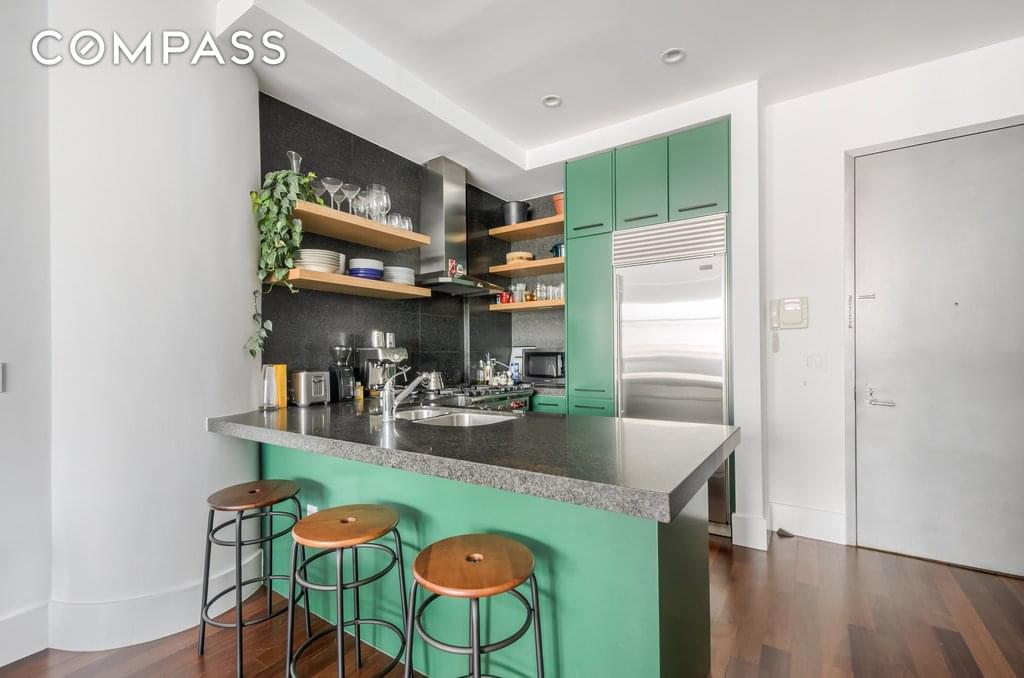 The loft has been thoughtfully updated, featuring brand new oak flooring and modern amenities. A new Bosch washer and dryer, as well as new HVAC units provide convenience and comfort. Structural enhancements, such as added storage nooks and sleeker, larger doors, have been implemented to optimize the living space. The open kitchen has been tastefully renovated, with green-hued cabinets complementing the elegant granite countertops. State-of-the-art appliances include a Wolf range, vented hood, Sub-Zero refrigerator, and Asko dishwasher to ensure a top-notch culinary experience, while ample storage space keeps everything organized.