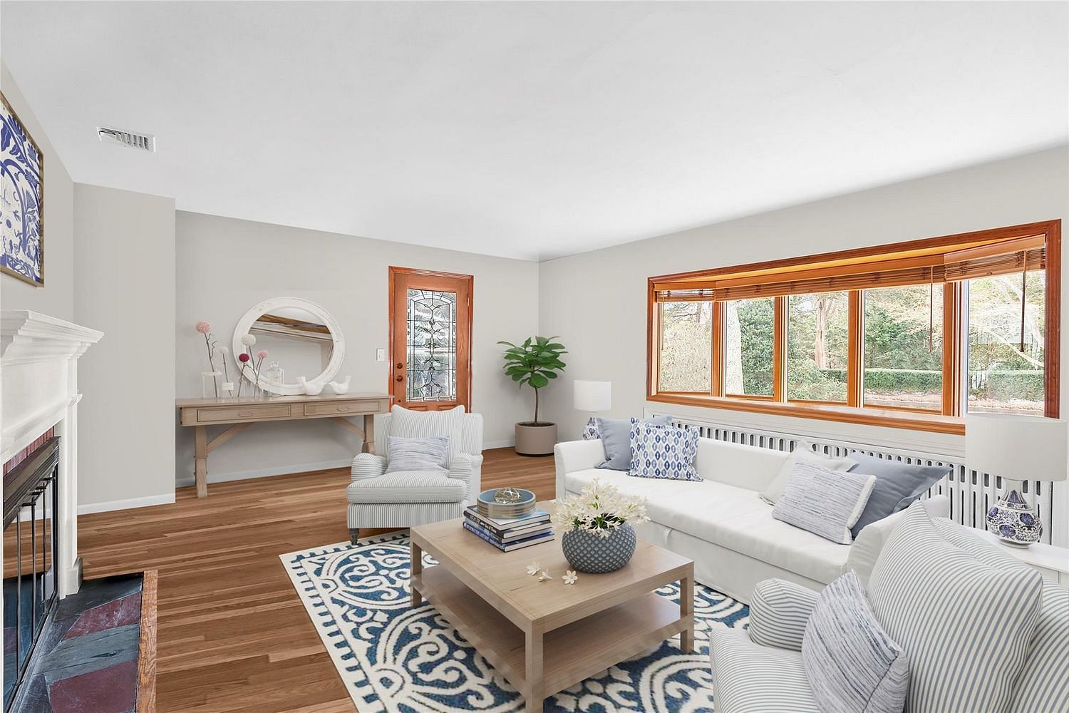 Introducing a beautifully maintained ranch-style beach house from circa 1950s, featuring private beach access in the hamlet of South Jamesport. This charming property also includes a deeded dock conveniently located within the association's boat basin, all situated on a picturesque, winding street. Upon entering the home, you will be welcomed by quaint arched doorways, a formal dining room, and an updated kitchen, designed for casual seating; perfect for hosting friends and family. The spacious living room is filled with natural light and features a wood-burning fireplace, built-in shelving, and a side door leading to al fresco dining on the back patio. The home boasts wood floors throughout, a primary bedroom suite with generous closet space, and a guest bedroom accented by an arched window nook. The hall bathroom has been recently remodeled and has a coastal vibe with chic blue tile, updated countertops and fixtures. Situated on over a third of an acre, the backyard includes a patio with an awning, a fire pit, an outdoor shower, and ample room for a pool. Additional features of the property include a full basement and a one-car garage. A new roof was installed in 2024, and recessed cast iron radiators add a finished touch to the home's character. Enjoy all the North Fork has to offer, with vineyards, farmstands, boutique shops, and dining all nearby.