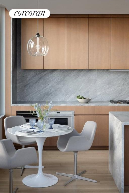 The open concept kitchen features top-of-the-line stainless steel Gaggenau appliances including: refrigerator and freezer, gas range, dishwasher and speed oven, complement Italian walnut cabinetry, honed Grigio Nicola marble countertops and slab backsplash. The spacious primary bedroom boasts a dressing area and a 3-fixture bathroom including radiant heated floors, honed tundra gray marble countertop and custom lighting designed by Sheppard.