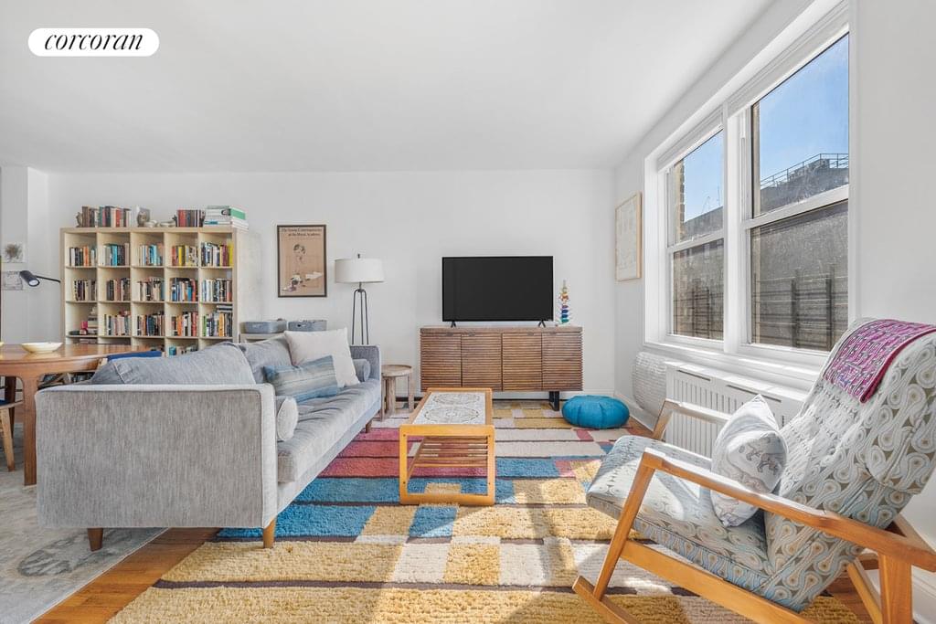 With west and northern exposures, this 4th floor apartment has treelined and sky filled views. The open plan living, dining and foyer affords multiple uses of this space while the eat in kitchen allows for more intimate meals. The two bedrooms are on opposite sides of the apt with a shared bath (with shower and tub) and a reading nook in the middle. Multiple closets and a huge walk in closet make life clutter free and manageable.