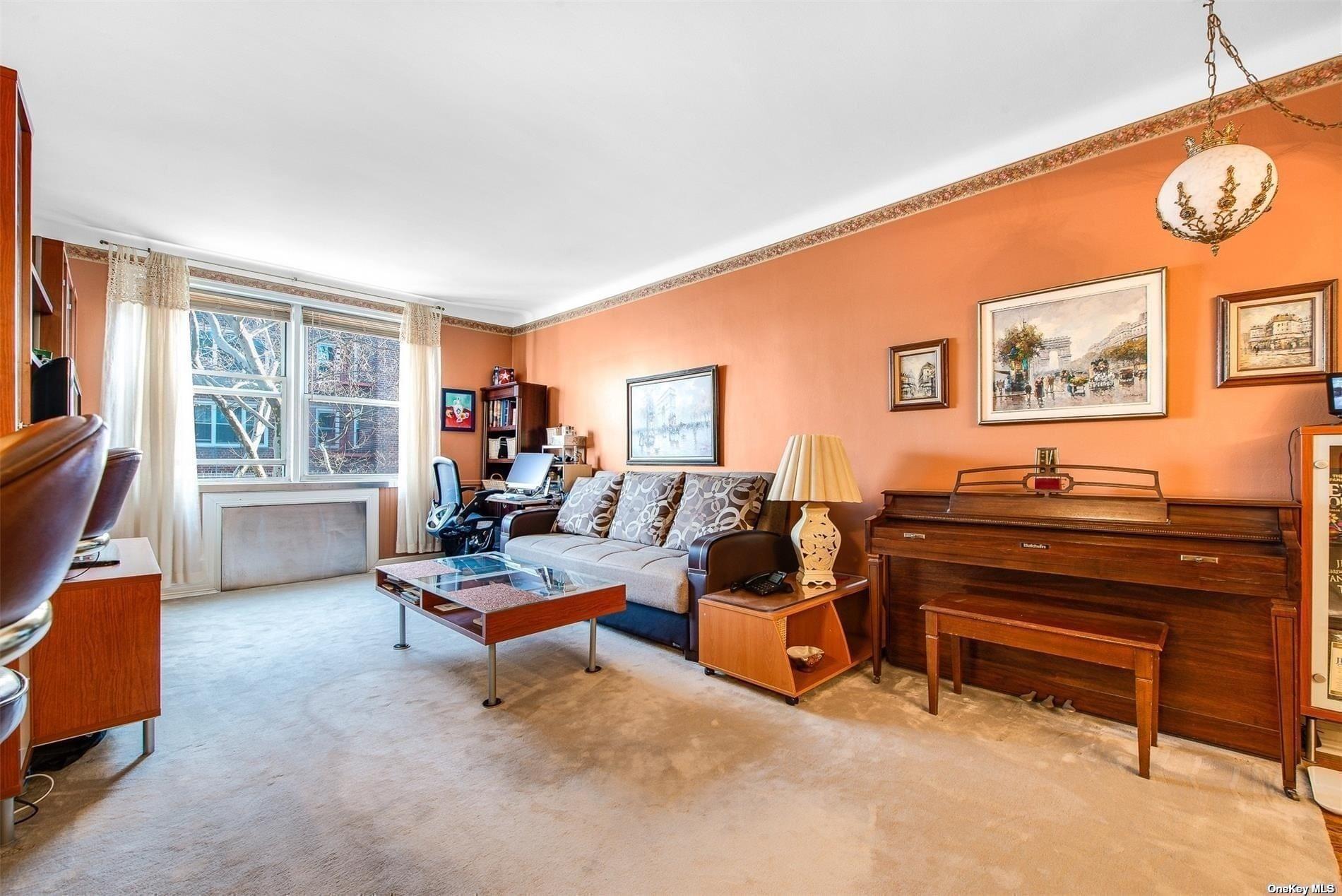 Sprawling, well-maintained 2-Br, 2-Bath at the Rhode Island in Rego Park. You enter a private foyer with a coat closet that leads to the large gallery, currently used as a dining room, then opens to a comfortably sized LR with oversized windows. The raised entertainment area, perfect as a breakfast nook, leads to the windowed eat-in kitchen. A vestibule separates the living quarters from the sleeping quarters. The primary BR comes w/lots of closet space, double oversized window exposure & an en-suite windowed bathroom with a stall shower. A full windowed bathroom with a square original soaking tub precedes the secondary bedroom, which also features a double exposure & large windows. This unit benefits from great light & fantastic layout with ample closet space. The Rhode Island is an established doorman building, near shopping at Rego Center & Queens Blvd, fine dining, schools & transportation, and subway at 63rd Drive. Blocks from Stephen Halsey JHS & PS 175.