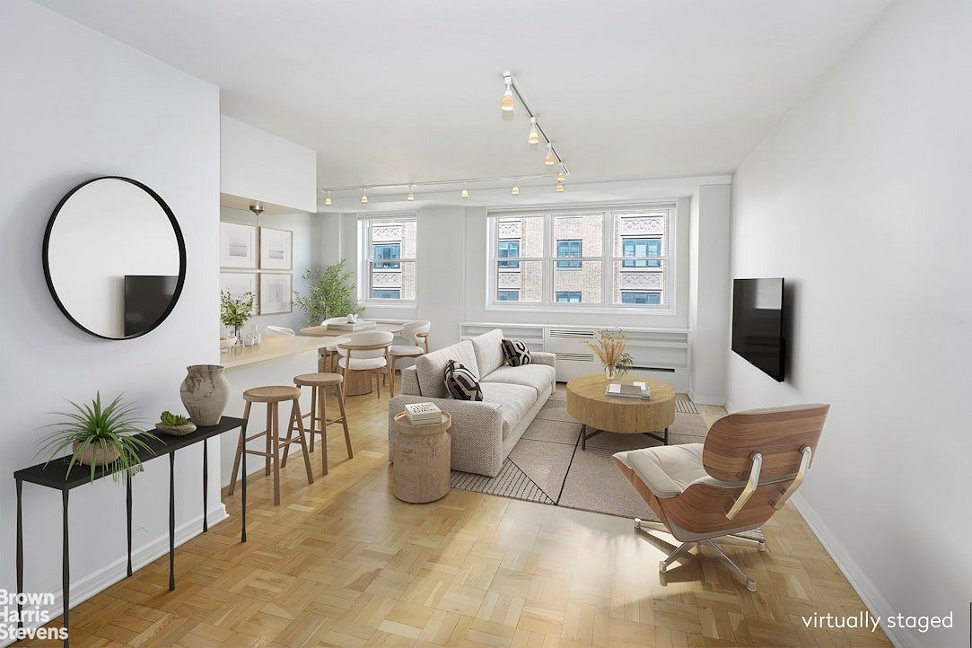 Step into this beautifully renovated, custom-designed convertible two-bedroom home in one of Greenwich Village's premier condops. The expansive living room is bathed in natural light from oversized windows spanning wall to wall, offering charming views of 10th Street and a glimpse of the iconic Grace Church. Custom-built cabinetry below all windows-including bookshelves, cabinets, and A/C covers-adds both elegance and functionality throughout the apartment.