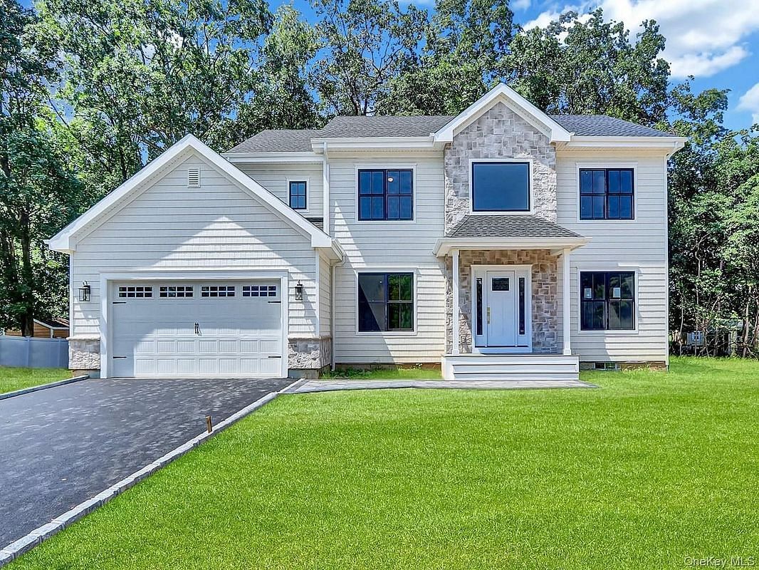 This is a rare opportunity to own new construction in Setauket, featuring a 2891 square foot custom Colonial set on a quiet cul de sac on a .75 acre lot. The exterior includes cedar style shake siding, white trim, partial stone facade, Andersen windows, a solar ready architectural roof, covered front portico, and a two car garage with opener and awning windows. Inside, the home offers a grand two story entry, hardwood floors, recessed lighting, custom moldings, and nine foot ceilings on the first floor. The open layout includes a chefs kitchen with stainless steel appliances, shaker cabinetry, quartz countertops, a center island with seating, pantry, mudroom, powder room, and access to the garage. The kitchen flows into a spacious great room with a gas fireplace, alongside a formal dining room and formal living room. Upstairs, the primary suite features a walk in closet and spa inspired bath with double sinks, while three additional bedrooms with large closets share a full hall bath with double sinks. The second floor also includes a laundry room with washer and dryer. Additional features are a full basement with eight foot ceilings, natural gas heat, two zone central air, and a 50 gallon hot water heater. Built by Kelly Development, an experienced Long Island builder with more than 30 years in the industry, the home comes with turnkey construction, pre move in cleaning, a new home orientation, and a comprehensive warranty. To be Built.