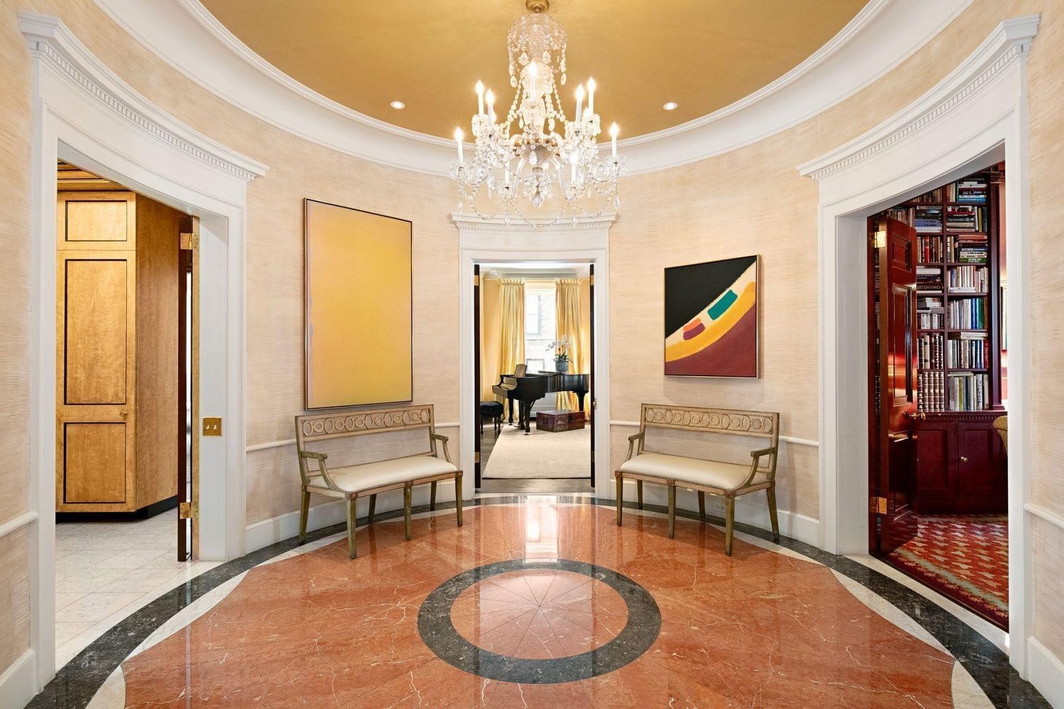 One enters the apartment from a private elevator landing leading into a foyer and the memorable circular entrance gallery. This delightful and unusual space serves as the hub of the apartment and the living room, library, and stunning Biedermeier style wet bar all radiate out from it. The elegant corner living room, facing Park Avenue, is of exceptionally large size with woodburning fireplace and flows into the equally impressive sun-filled formal dining room that comfortably seats 18 people. The intimate library, with woodburning fireplace, is fitted with bookshelves.