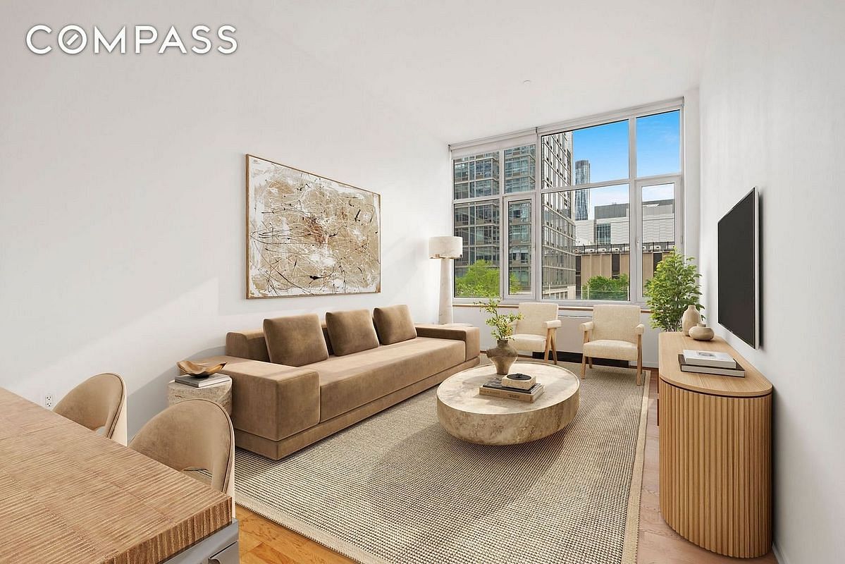 Spanning 837 square feet with 11-foot ceilings, this spacious home is filled with south-facing sunlight and enjoys open-sky views in the oversized living room, while the sleek, open chef's kitchen dazzles with excellent cabinet space, a breakfast bar and top-notch stainless steel appliances. Gleaming white oak floors guide you to the south-facing bedroom where you'll find two large closets. The bathroom is filled with floor-to-ceiling marble, the adjacent hall closet provides ample storage space, and the in-unit washer-dryer adds effortless convenience to this sunny Hell's Kitchen home.