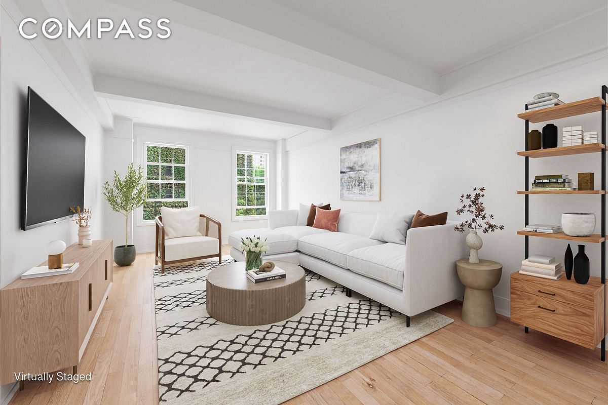 Throughout the home, classic pre-war details enhance the timeless appeal, including pristine hardwood floors, high beamed ceilings, and exposures to the east, west, and north. The layout is ideal for both relaxed living and formal entertaining.