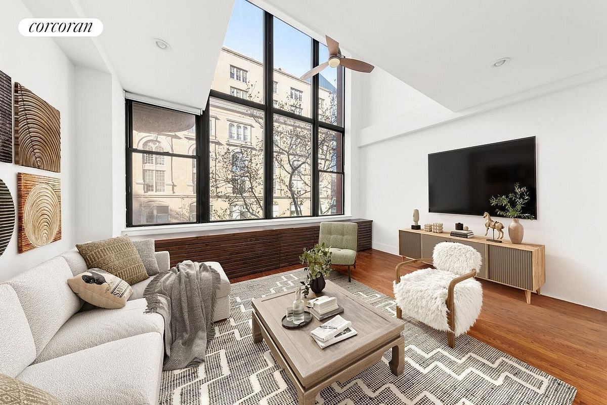 Welcome to a rare duplex one-bedroom offering 17-foot ceilings, soaring windows, contemporary finishes, and a uniquely spacious layout in one of downtown's most vibrant locations. This sun-filled home features an open-concept living and dining level with double-height windows overlooking Cooper Square, bringing in excellent natural light throughout the day. The expansive great room easily accommodates both living and dining areas, and the dramatic ceiling height creates an airy, loft-like feel. The newly renovated kitchen is outfitted with sleek white cabinetry, modern hardware, a large peninsula with breakfast bar seating, and a clean, neutral palette that blends seamlessly with the space. Upstairs, the generous bedroom level provides exceptional privacy and flexibility. With abundant closet space, room for a king bed, and an open mezzanine-style layout, the upper floor feels bright and oversized - a rare separation of space for a one-bedroom in this neighborhood. A private storage closet located on this level offers valuable additional storage rarely found in similar East Village homes. The bathroom has been tastefully updated with modern tilework, a glass-enclosed shower, contemporary fixtures, and clean, minimalist lines. Additional highlights include hardwood floors throughout and the character and warmth you expect from an East Village home - paired with a fresh, modern renovation. Located at the nexus of the East Village, NoHo, and the Bowery, 65 Cooper Square places you moments from some of downtown's best dining, nightlife, cafés, and transportation. Convenient access to Wegmans, Astor Place, and multiple subway lines including the 6 and R/W trains. A stylish, move-in-ready duplex with incredible volume, light, and storage - this is East Village living at its best.
