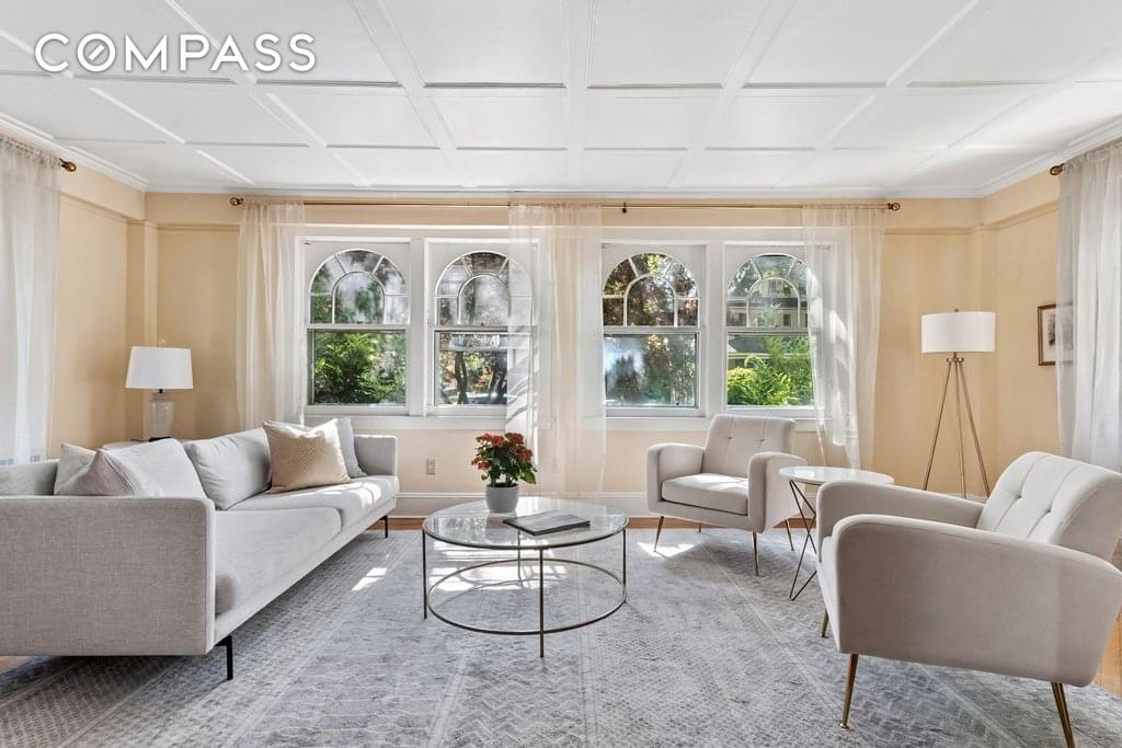 Parquet floors with inlaid borders grace the first floor, flowing from the large sunlit dining room through the foyer into the double parlor in the front of the house. The proportions of the rooms are generous with high beamed and coffered ceilings. Light floods into the front parlor through seven elegant arched windows: this room offers a formal sitting area, a separate space for an informal table for jigsaw puzzles, card games or an ideal spot for casual dining. On the opposite side there is lots of room for a child's play area, large piano or a simple bookcase.