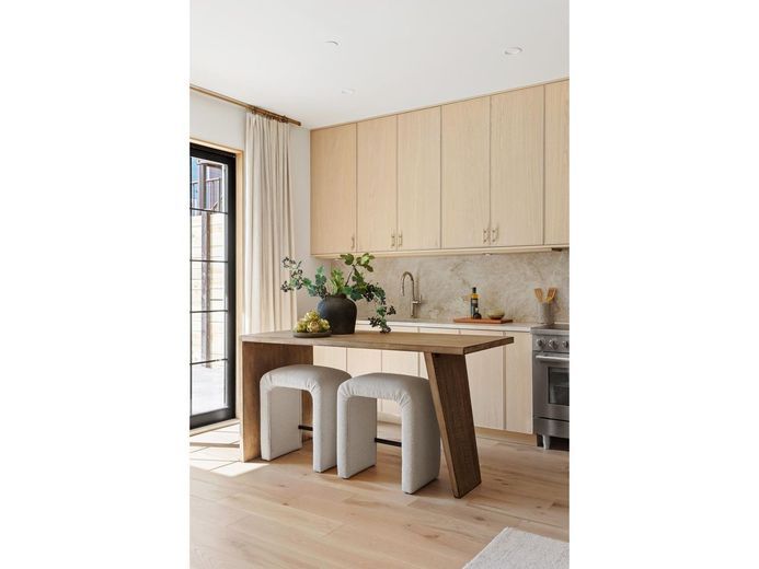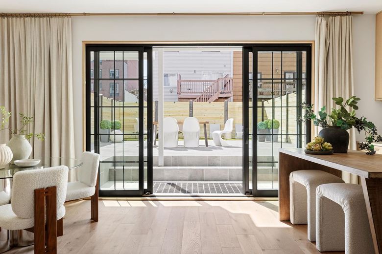 The sun-drenched, South-facing living room boasts white oak flooring and high airy ceilings. This entertainment area flows seamlessly into the backyard, creating an open and inviting indoor-outdoor experience. The modern chef's kitchen is outfitted with light oak cabinetry, new top-of-the-line appliances, and stunning Taj Mahal quartzite countertops. The spacious lower level provides incredible flexibility, complete with a half bath, a large laundry room, and natural light.