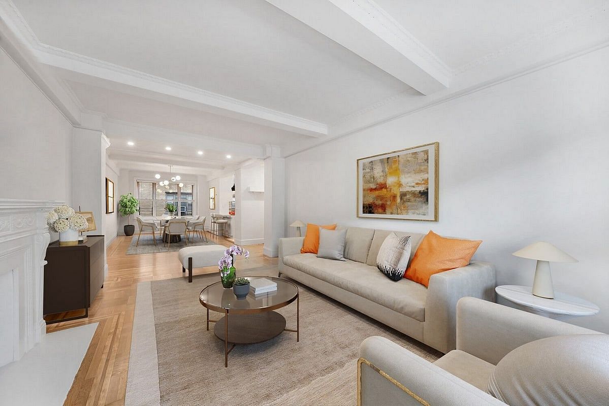 The chef's kitchen features beautiful custom cabinetry and quartz countertops and is equipped with top-of-the-line appliances including a Wolf range, Sub Zero refrigerator with a water filtration system, Fisher & Paykel dishwasher, GE Profile microwave and LG washer/dryer. Special highlights include an original decorative fireplace, generous custom-designed closets plus a large walk-in cedar closet, high beamed ceilings and beautiful original hardwood floors with border trim.