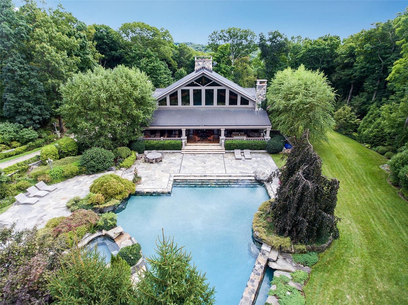 Stunning Spaces. Spectacular Country House with absolutely jaw-dropping interior-- vaulted ceilings, massive beams, walls of windows, exposed stone, concrete floors with black walnut inlays and custom millwork. Phenomenal Great Room with floor-to-ceiling stone fireplace, 35’ ceiling and wet bar. Open Black Walnut Kitchen with top-of-the-line appliances. Wall of Nano folding doors to 65’heated, covered porch with outdoor fireplace and built-in barbecue. Comfortable Den with custom built-ins. Recreation Room with coffered ceiling and wet bar. 10-seat Theater. Yoga/Meditation Room with fireplace. Private Primary Suite. First floor Guest Suite. Two additional Bedroom Suites. His and Her Spa Baths with steam room and sauna. Over three, professionally landscaped acres with fine trees, rare shrubs and perfect privacy. Salt-water Swimming Pool with two endless edges, waterfall and spa. Quiet setting yet just moments from Bedford Village. Every amenity and just listed!