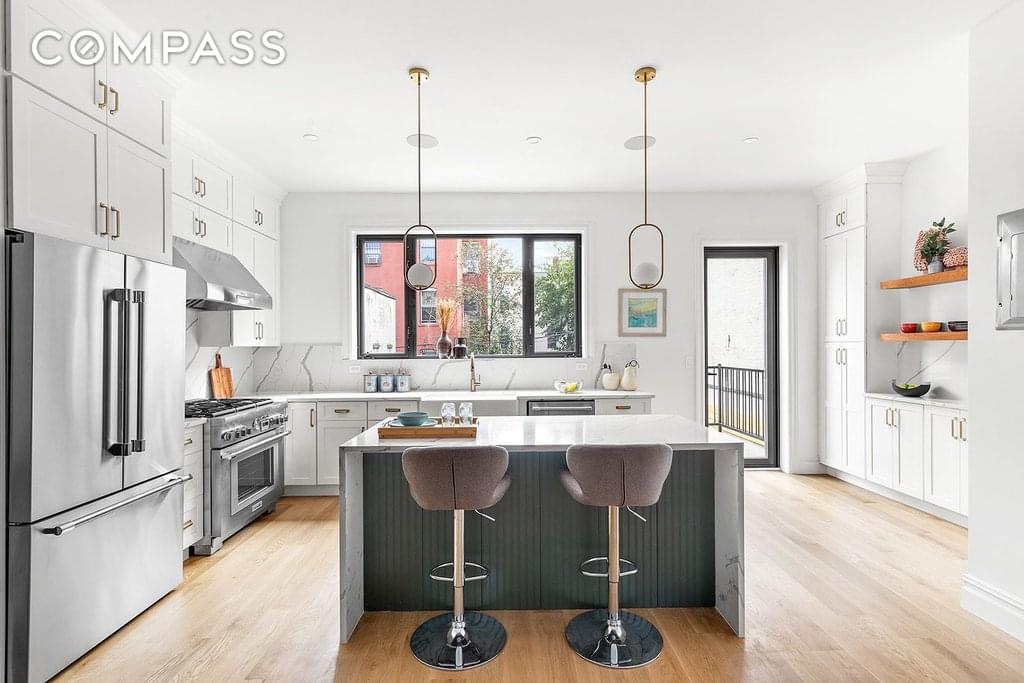 The parlor level welcomes you with an open floor plan that seamlessly integrates the living room, dining room, and chef's kitchen. White oak hardwood floors grace the interior, while a Nest thermostat and security system ensure comfort and peace of mind. Built-in Bluetooth speakers set the mood, and the kitchen is a chef's dream, featuring custom white cabinetry with brushed brass hardware, a Calacatta marble island with sage green accents, a wine fridge, a farmhouse sink, and a suite of stainless steel appliances, including a gas range oven and a convenient pot filler. Large windows overlook your own private oasis a beautifully landscaped backyard. Step outside onto the deck off the kitchen to enjoy the outdoors from the comfort of your home.