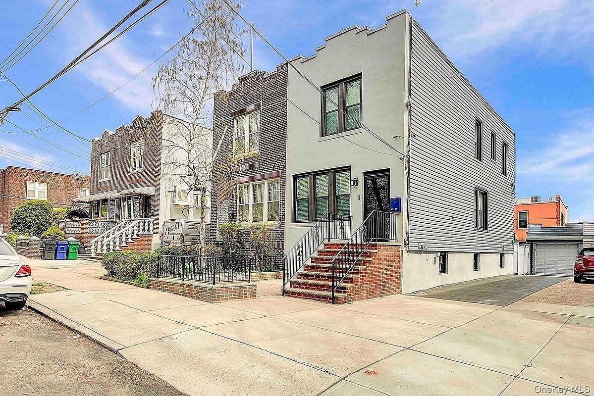 This charming, semi-attached brick home in Middle Village has been tastefully updated with new stucco and siding, offering a seamless blend of classic character and modern convenience. The main floor features an inviting layout with a spacious living room, a formal dining area, an updated kitchen, and a convenient powder room, all providing easy access to a private, vinyl-fenced backyard and deck. Upstairs, you will find three sun-filled bedrooms with ample closet space—including a generous primary bedroom—and a modern full bathroom, while the finished basement offers a legal recreation space with storage cabinetry and an additional half-bath. This move-in-ready residence is packed with recent mechanical upgrades, including a central AC system for the first floor, a new heating furnace, a hot water heater, and updated windows throughout. Situated just minutes from the scenic trails of Juniper Valley Park, Metropolitan Avenue's vibrant dining, and Atlas Park, the home also includes a private driveway, a one-car garage, and a full suite of appliances: a washer, dryer, dishwasher, second-floor window AC units, and a bonus refrigerator in the basement