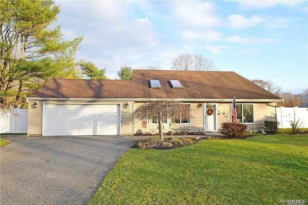 Expanded Cape situated in a private, serene location, offering the perfect blend of comfort and style. This sun-drenched home features soaring vaulted ceilings and skylights that fill the space with abundant natural light. The main level includes a spacious primary bedroom, an eat-in kitchen, convenient laundry area, and direct access to a two-car garage.