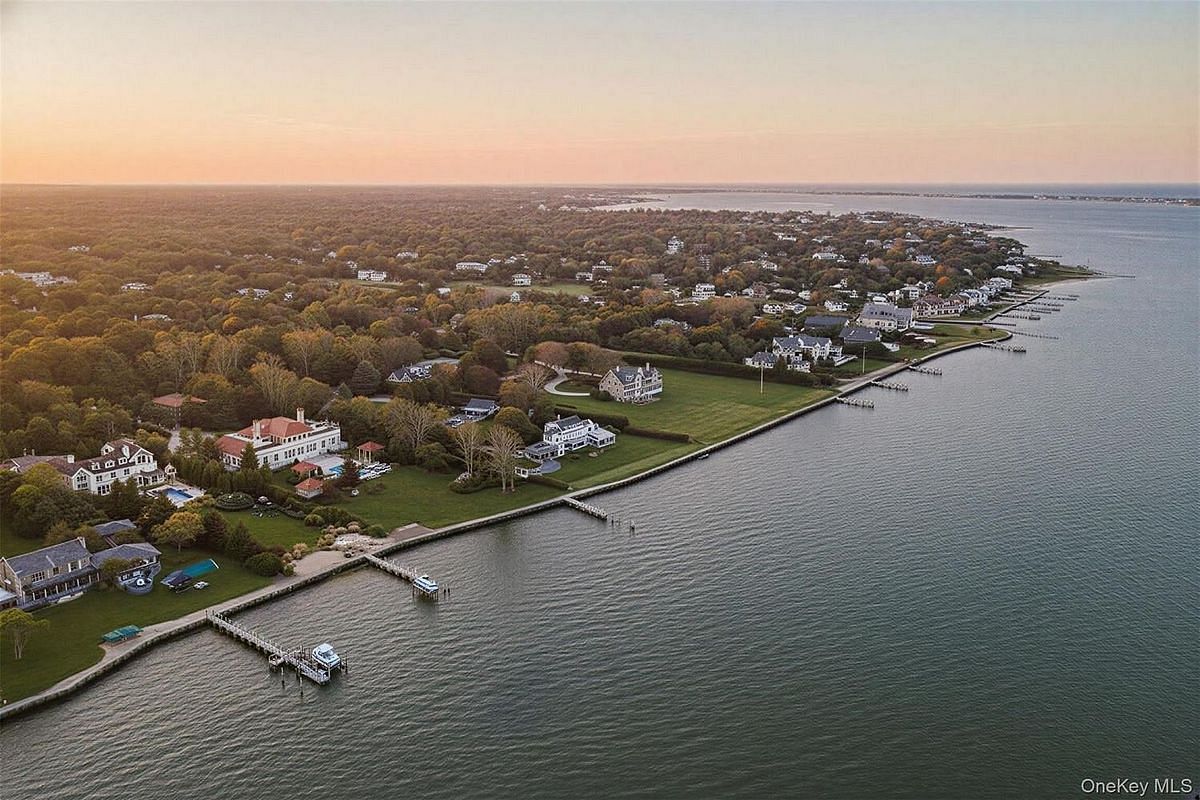 Privately set behind gates on one of Remsenburg's most coveted lanes, this exceptional waterfront estate offers approximately 175 feet of pristine bulkheaded frontage along Moriches Bay, capturing breathtaking sunset views and an unparalleled sense of serenity. Spanning approximately 8,250 square feet, the Mediterranean-inspired residence is constructed with remarkable integrity, reinforced with steel beams throughout, and thoughtfully designed for both grand entertaining and effortless resort-style living. A dramatic grand salon serves as the heart of the home, featuring soaring coffered ceilings, a wood-burning fireplace, custom bar, and multiple seating areas-all seamlessly opening through French doors to the waterfront grounds. The chef's kitchen, appointed with granite countertops and an oversized island, flows into the dining area, while the main level also includes four en-suite guest bedrooms, a flexible gym or wellness space, sauna, and powder room. The entire second level is devoted to a private primary retreat, complete with a fireplace, study, bespoke dressing rooms, and a spa-caliber bath with steam shower and soaking tub. A 35-foot covered terrace overlooks the pool, cabanas, and sweeping bay views. Outdoors, the estate transforms into a true waterfront sanctuary with a 25' x 45' heated gunite pool, two open-air cabanas, expansive manicured lawns, and a private sandy beach area. A fully equipped dock with floating slips, water, and electric completes this rare offering for boating enthusiasts. Additional amenities include an approximately 3,000 square foot carriage house with a four-car garage and a two-bedroom guest or staff residence above, as well as a separate three-car garage and service bay at the main residence. Now reintroduced to the market, this is a rare opportunity to own a generational waterfront estate defined by scale, privacy, and enduring craftsmanship.