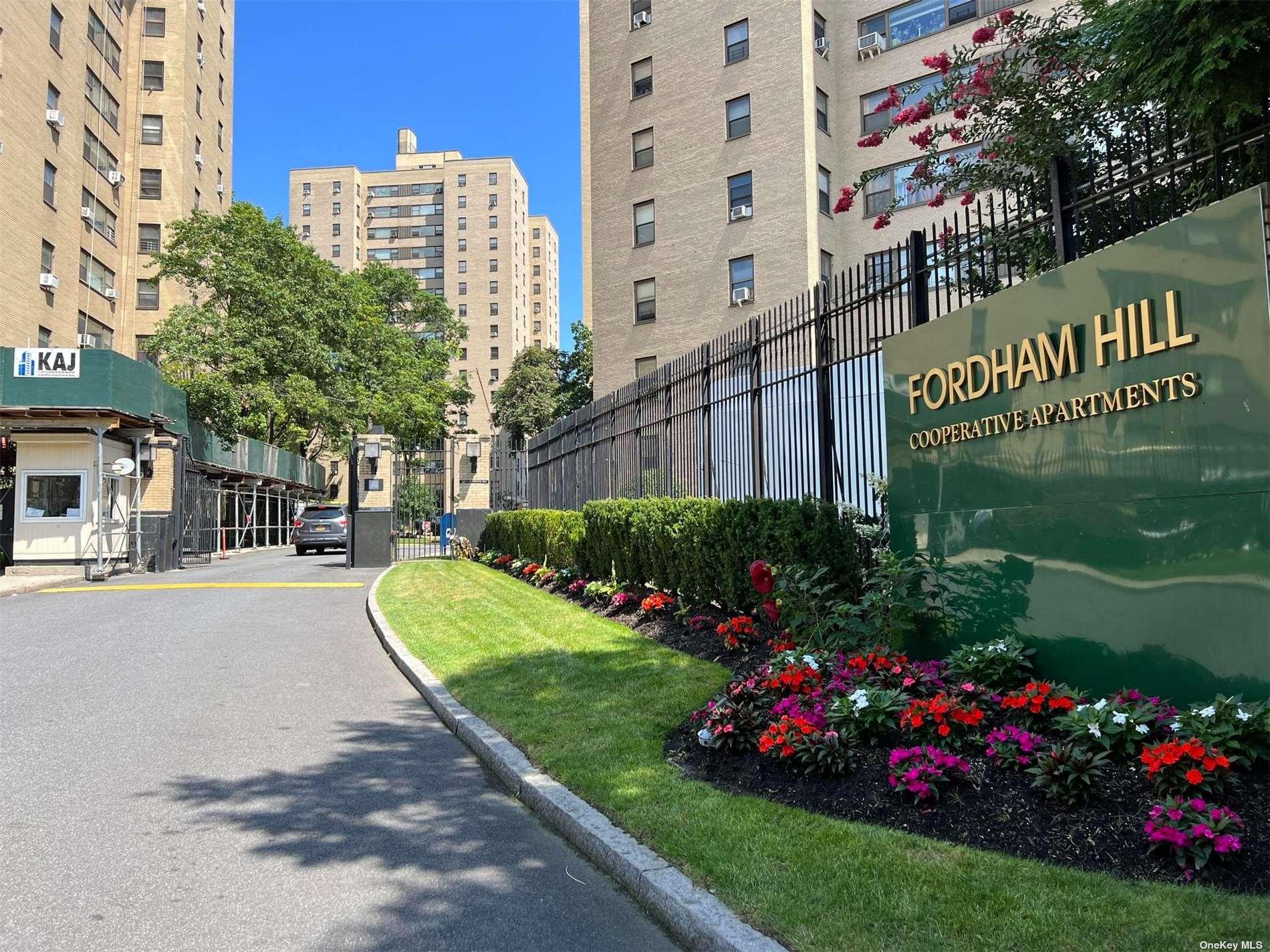 Welcome to renovated, light, airy and bright at Fordham Hill Oval in the University Section of the Bronx. Beautiful oasis of a gated community with well manicured lawns, garden with sitting areas for residents to enjoy the outdoors, playgrounds and more. In the Sussex building ( Building 7), Unit 7F is totally renovated and move in ready. This 2 bedroom, 1 full bath unit has been freshly painted and the floor sanded. Unit 7F features an entire wall of large windows facing the courtyard which allows natural light to just flow into the apartment. It is a lovely view of the trees and garden. The primary king sized bedroom has double closets and plenty of space for additional furniture. There is a privacy glass door that separates the sleeping quarters from the living, dining room and kitchen. Really neat! The bathroom is split with 2 sinks, European styled with Commode and sink adjacent to tub, shower and sink .The beautifully renovated bathroom boasts lavish imported tiles and contemporary lighting fixtures. The kitchen is immaculate with Stainless steel appliances, granite countertops, plenty of cabinetry, a pantry and storage. Easy Public transportation nearby, the BX1, Bx2, Express bus to Manhattan, Subway #1 & #4 trains and Metro North are all accessible. Management office is onsite. Amenities include, community room, gym, storage lockers, package room, laundry room in building basement. ALL UTILITIES ARE INCLUDED IN THE MONTHLY MAINTENENCE....EVEN ELECTRIC.....insurance and taxes are also included. $15 FOR CABLE. The parking garage across the street offers discount to residents...otherwise Street parking. 24Hours security and maintenance. It is Minutes to NYC...start packing and give me a call!!!