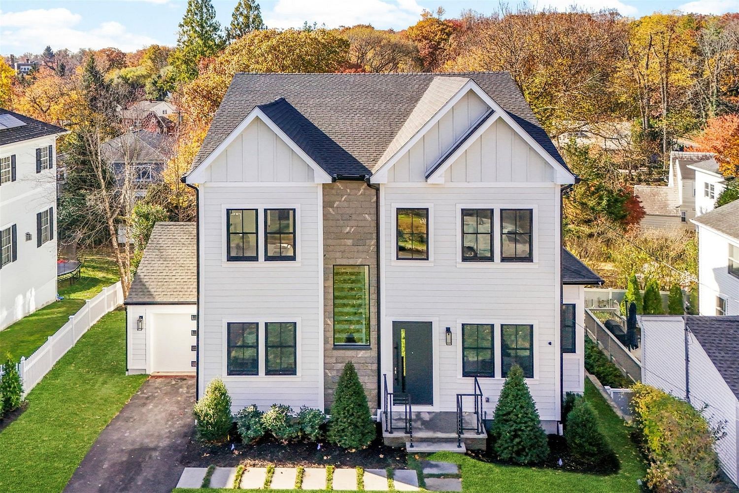 Introducing a stunning, newly constructed six-bedroom Contemporary Colonial in the highly coveted Larchmont Gardens neighborhood. This home is a masterpiece of modern architecture and luxury living, showcasing a thoughtful design that maximizes natural light and spaciousness for an unparalleled blend of style and comfort. Enter through the sun-drenched 20' entry foyer, leading to the oversized living room and adjacent formal dining room. The heart of the home is the breathtaking great room, boasting a dramatic 20' lofted ceiling, expansive architectural windows, and a striking eco-friendly fireplace. The open-concept chef's kitchen, complete with a waterfall quartz center island, custom cabinetry, and stainless steel appliances, seamlessly flows to a spacious deck, ideal for outdoor entertaining. A convenient home office with an ensuite bathroom provides an ideal work-from-home space or a comfortable guest suite. The second level presents a luxurious primary suite, a true retreat featuring a private deck, custom his-and-hers walk-in closets, and a spa-like primary bath. Three additional generously sized family bedrooms, each with its own ensuite bathroom, complete the second floor. The lower level family room, featuring a wet bar and direct access to the bluestone patio, is perfect for casual gatherings. A large bedroom with an ensuite bathroom provides additional guest or in-law suite options. This exceptional home is a must-see!