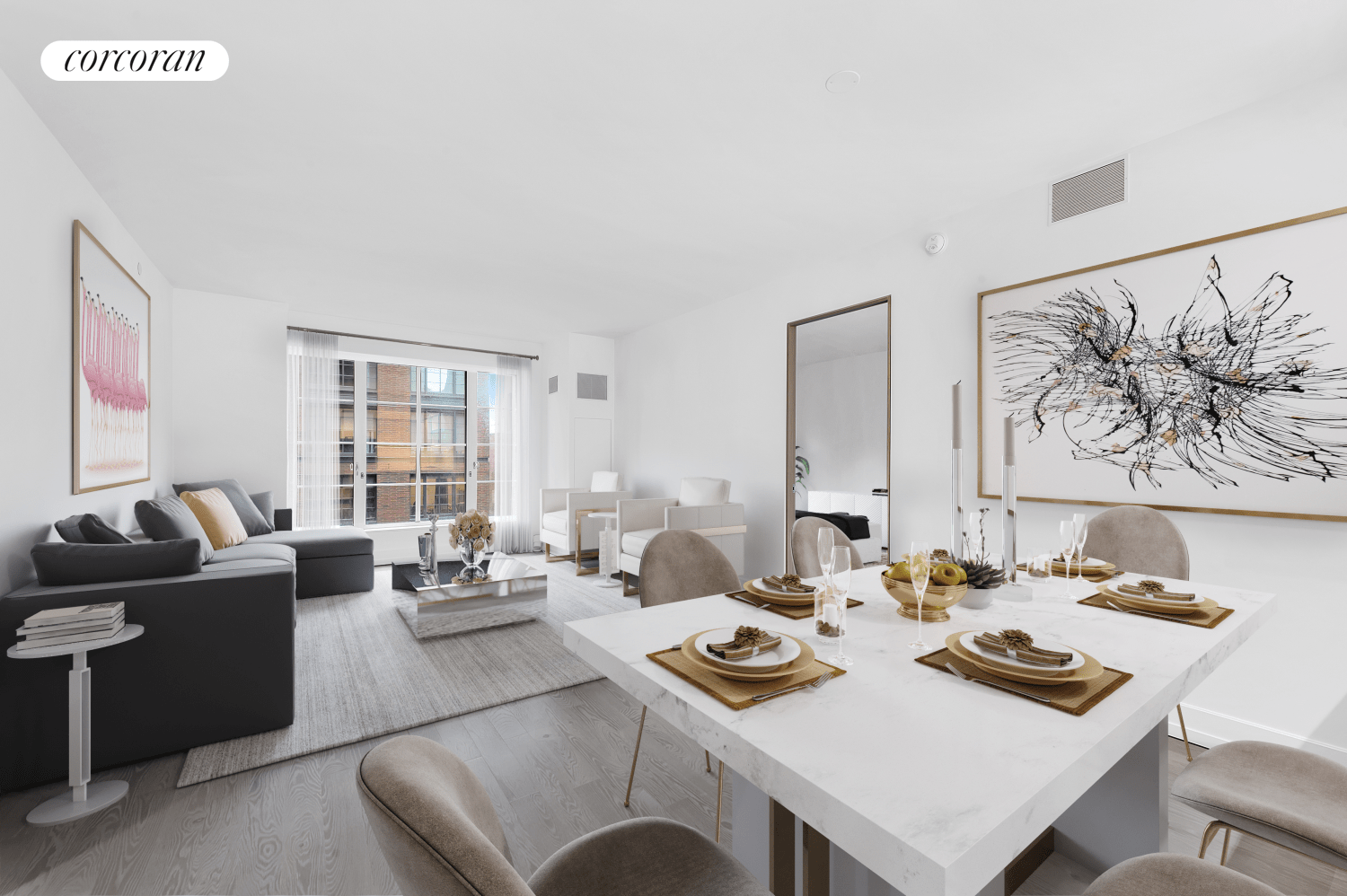 Rarely available, split 2 bedroom, 2.5 bathroom apartment at luxurious amenity-rich 70 Charlton Street, in the coveted West Soho/Hudson Square enclave just below West Houston Street! Enjoy true downtown living in a vibrant neighborhood framed by Soho, Tribeca and the West Village, in a stunning modern turnkey residence. Oversized windows on southern exposures bathe the open-plan living/dining room and both bedrooms with natural light and showcase lovely courtyard views. This airy 1,323 sf gem also features an open gourmet kitchen with a breakfast bar, divine master bedroom suite with a big walk-in and second closet, 5-fixture master spa bath with dual sinks, soaking tub and spa shower, second beautiful bedroom suite, powder room off the foyer, and an in-home washer-dryer.