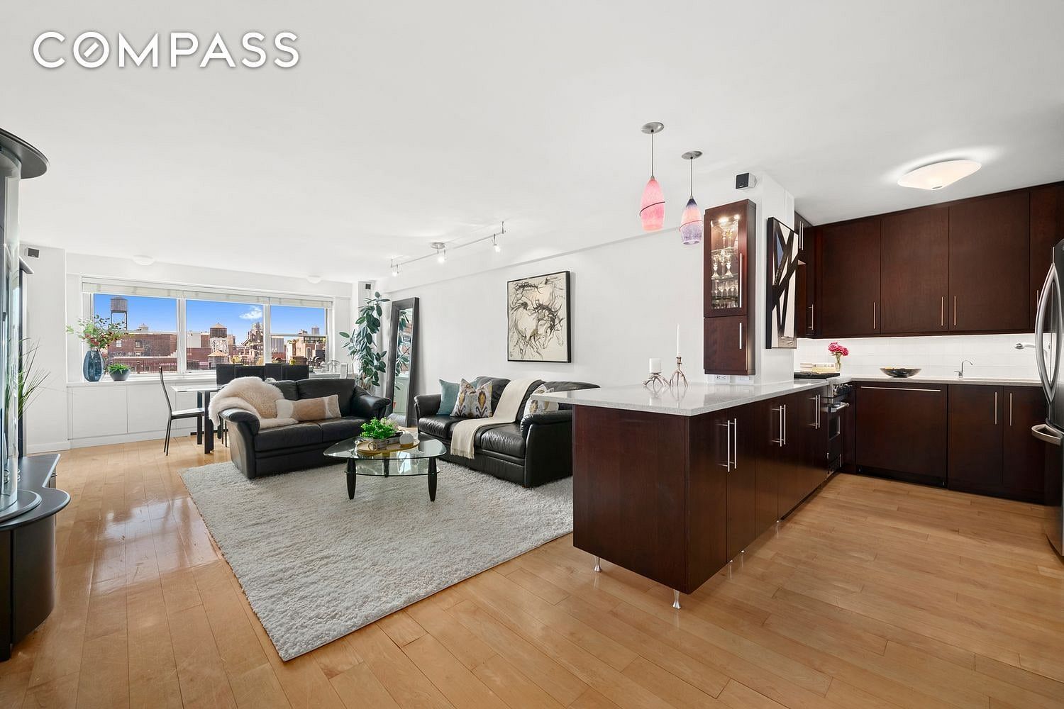 The expansive living room/dining area is bathed in natural light from the unobstructed western-facing windows, offering open sky and endless scenic open views over the rooftops and water towers of Greenwich Village displaying the many layers of the Greenwich Village skyline. Additional built-in millwork discreetly houses the PTAC system while providing extra storage space.